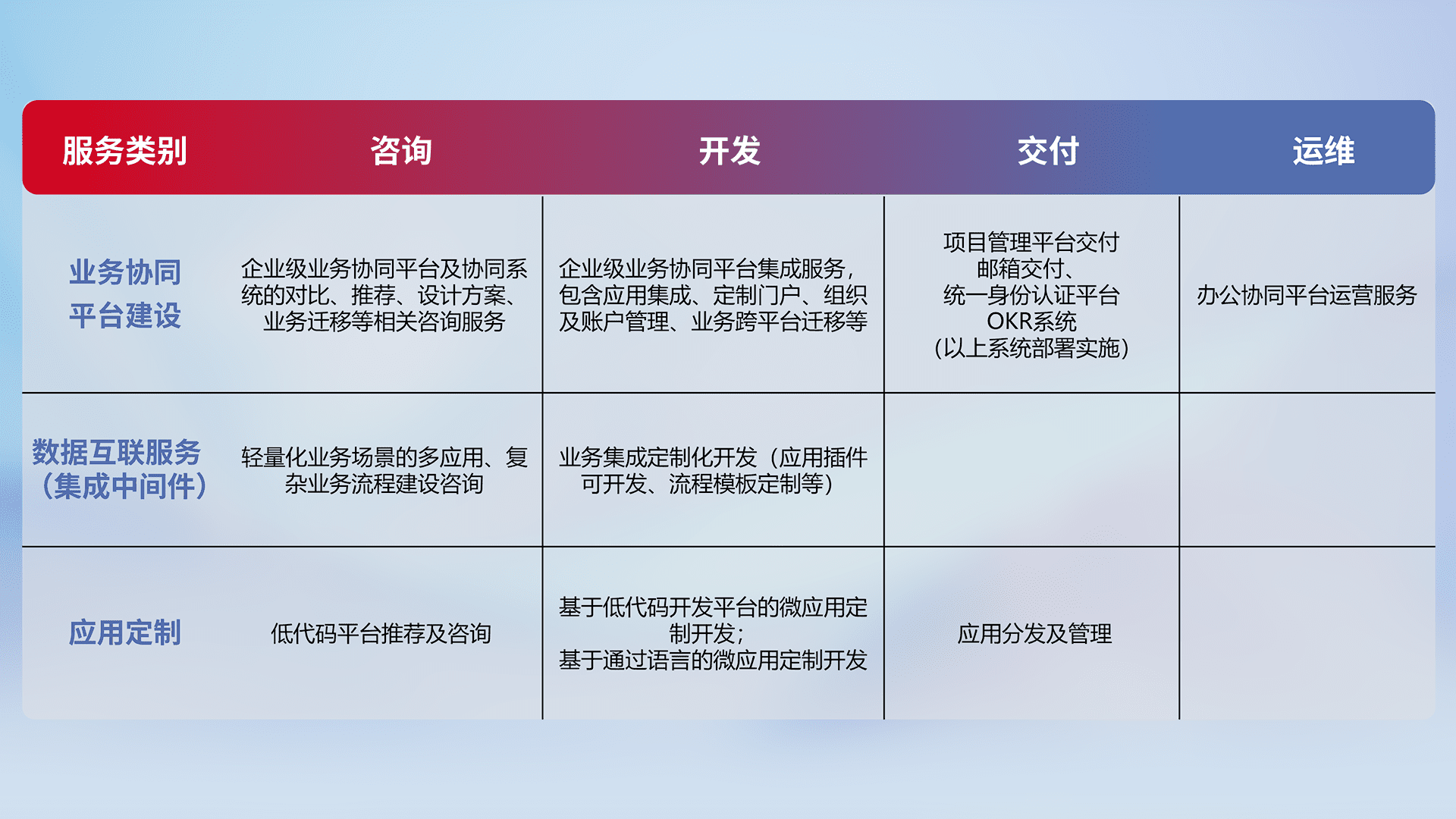 针对钉钉、、、、企微、、、、IDaas等平台级产品提供产品的规划、、方案、、、交付、、、定制化开发等服务,,实现如统一协同办公、、、、智能客户服务、、混合会议管理、、、、智能数据查询、、、、等业务场景,,,实现数字化转型。。